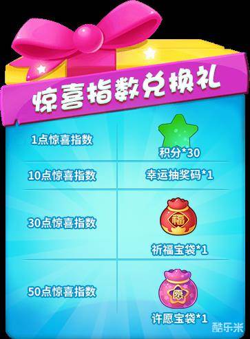 活动内容:活动期间,每接收1个非绑定的惊喜福袋可以累积1点“惊喜指数”,在活动期间任意时刻,使用“惊喜指数”可以重复兑换下列奖励: