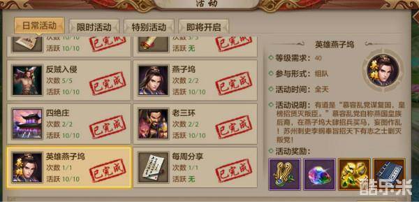 目前游戏中的四个副本,根据玩家等级,每天都可以参与两次。副本的难度也都是比较简单。40级以上玩家会开启英雄副本玩法。每天会开放一个副本的英雄挑战玩。每天可以参加一次。