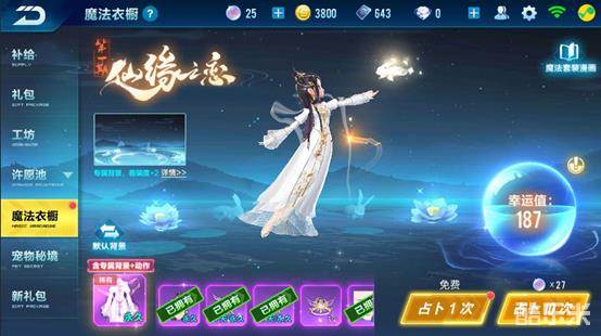 魔法衣橱奇幻登场,你喜欢的这里都有!3月28日起,魔法衣橱系统上线,将带来首发套装嫦娥仙子/天蓬元帅套装,玩家在魔法衣橱中使用水晶球进行占卜将有机会获得这一稀有奖励哦!水晶球售价10钻/个,每次占卜将消耗3个水晶球。