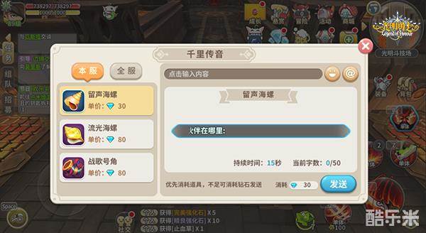 除了跨服招募之外,传音功能上线!使用海螺即可让本服或者其他服务器的玩家听到自己的声音了,就算不打开聊天栏也能看到。不同的海螺还会让信息各种颜色和特效。