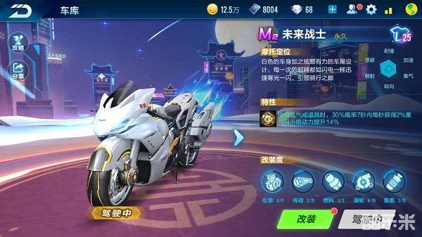 未来战士各项属性均非常优秀,耐撞和漂移能力尤为突出,加上出色的特性,使它在竞速和道具赛中都拥有非常完美的发挥,是一辆非常值得入手的M2摩托。