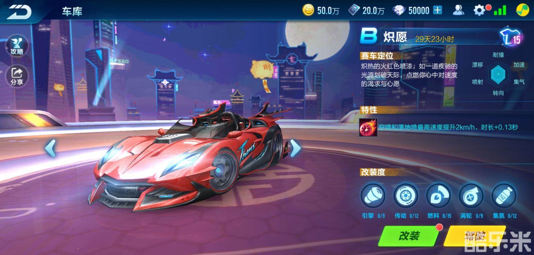 炽愿综合能力优秀,其转向和喷射能量尤为突出,搭配实用的特性,在各赛道的跳台路段中都有非常出色的发挥,而且还可以通过活动免费获得,是一辆值得入手的赛车!