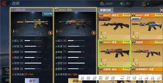 上图所示的就是凤凰之魄与M4A1-黑龙的属性对比情况了,大家可以看到两把武器的威力、射速、穿透属性相同,仅仅在精准度,稳定度以及便携度三大方面略有落后。毕竟一把是橙色品质武器,另一把是英雄级武器,两把武器都不在一个等级上,这样的属性已经非常不错了,性价比还是蛮高的。
