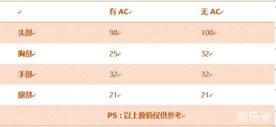 根据上述信息,我们可以看出:无AC时,被斯太尔-赤龙命中头部一发瞬秒、胸部和手部4枪、腿部5枪;反之,若目标配置有AC,那么头部需再次步枪,其他保持一致。