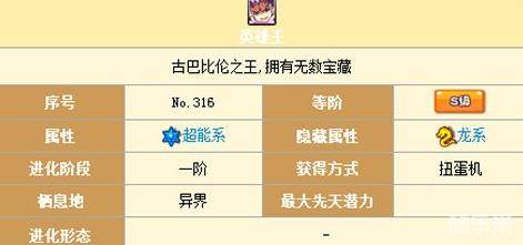 怪物X联盟宠物英雄王超能系No.316,英雄王属于超能系王者宠物,拥有龙系的隐藏属性,可通过扭蛋机获得。栖息地在异界,攻击力和魔攻值都高达90以上,战斗中的王者。宠物外观具有王者风范,帅气霸道。