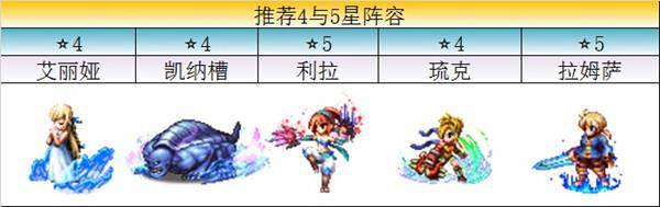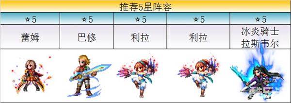 偏重于输出的一套阵容,双利拉的输出能力与冰炎骑士拉斯韦尔的尾刀组合,配合着蕾姆的回血能力,巴修的弱体能力与坦克能力,大大提高了BOSS战的攻略速度!!