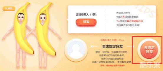 绑定一位好友,扔香蕉皮绊倒他,当香蕉皮扔到指定数量时,代表你好友的整蛊形象会滑行到指定奖励区域,带你解锁奖励。(PS:成功绑定后不可更换)