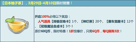 3月29日-4月10日,仅需6Q币,在飞车商城购买【日本柚子茶】,开启即可100%获得价值60Q币的【终极召唤卡】1张、【神灯券】20个、【赛车觉醒卡】12张、【初级魔法合成卡】3张。限时1折惊爆价,每个QQ只限购3次哦!