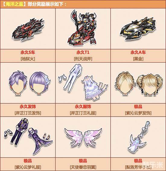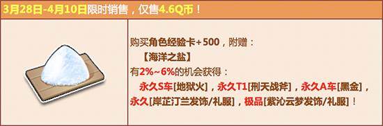 3月28日-4月10日,在飞车商城购买【角色经验卡+500】,赠送【海洋之盐】,有机会获得永久S车【地狱火】、永久T1【刑天战斧】、永久A车【黑金】、永久【岸芷汀兰发饰/礼服】、极品【紫沁云梦发饰/礼服】或其他奖励之一!其中核心极品期限型概率范围为:4%-6%,核心奖励永久型概率范围为:2%-4%,非核心奖励概率范围为:90%-94%。