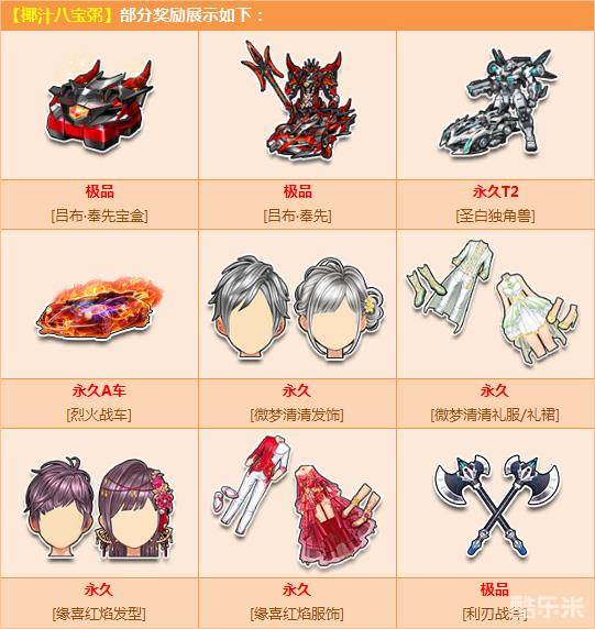 3月26日-4月6日期间,购【角色经验卡+1000】,赠送椰汁八宝粥,有机会得【吕布·奉先礼盒】,打开100%获得永久T2【吕布·奉先】,双人座椅【赤兔马】以及方天画戟,且宝盒会重复获得,另外还有几率获得极品T2【吕布·奉先】30天、永久T2【圣白独角兽】、永久A车【烈火战车】、永久【微梦清清发饰】/【微梦清清礼服/礼裙】/【缘喜红焰发型】/【缘喜红焰服饰】或其他奖励之一!其中核心奖励期限型概率为4%-6%,核心奖励永久型概率为2%-4%,非核心奖励概率为90%-94%。