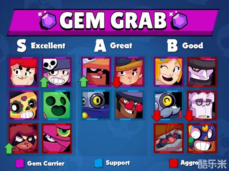 紫色框代表适合当水晶宝石持有型英雄,简单来说就是负责去捡宝石然后一直拿着宝石的英雄。