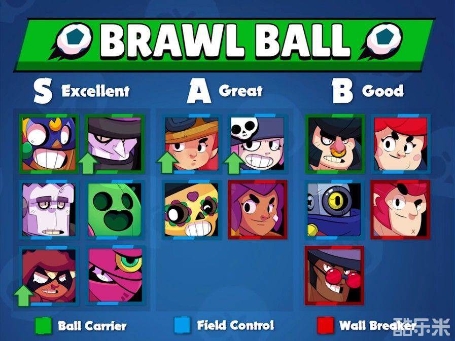 红色框框代表适合去拆墙的英雄(什么叫拆墙呢,这个模式里有很多障碍物墙,你要绕过障碍物才能更好的射门,拆墙的英雄负责把球门前的墙打烂就可以更容易的射门了)。