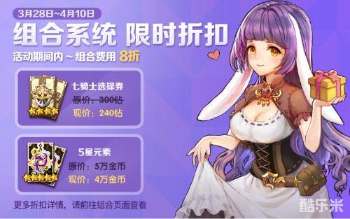 打折一时爽,一直打折一直爽。除了洗炼费用外,组合系统也迎来限时折扣,七骑士选择券直降60钻,五星元素直降1万金币。