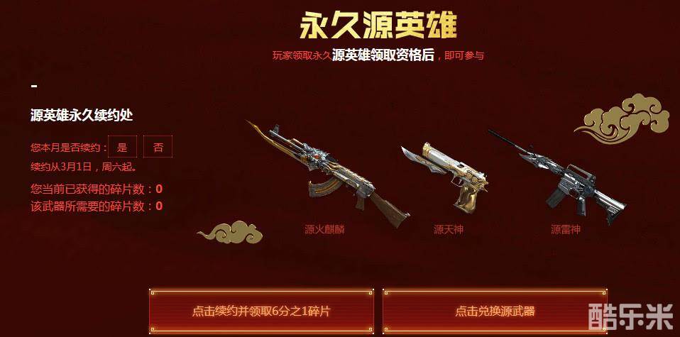 源武器的获取方式,大家也应该都非常的熟悉,因为官方已经不是第一次赠送了,每个月需要续约,再续约六个月后才可获得永久,而且在中间不可中断,如果中断将会永久取消资格,小伙伴在每一个月登录游戏,且到游戏网页进行续约,六个月之后,就可获得永久版本的源火麒麟。
