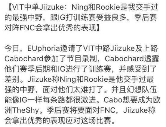IG训练赛从S7猛到了S8,当时参加S8世界赛的VIT战队中单选手也在这个节目中表示:IG的中野Rookie和ning是他交过手的最强中野,他们太难打了,希望自己的战队可以成为像IG一样每条路都很激进的风格。