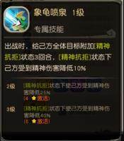 专属技能1 象龟喷泉:出战时,给己方全体目标附加[精神抗拒]状态3回合,[精神抗拒]状态下己方受到精神伤害降低10%