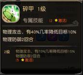 专属技能2 碎甲:物理攻击,有40%几率降低目标10%物理防御2回合
