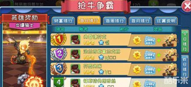 活动内容:玩家可以通过在休闲场中捕捉精英以上的宠物来获取积分,积分越高排名就会越高,积分的多少取决于您的套索倍数以及精英等级;套索倍数越高,获取的积分就会越高!温馨提示:(游戏中共分:每日排行、每周排行、每月排行,每种排行所获得奖励不同,每周及每月排行会根据玩家每日排行积分的累计进行排名;榜单的结算周期为:每日榜单会在次日零点结算更新,每周榜单会在每周一零点结算更新,而每月榜单会在次月1日零点进行结算更新);
