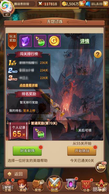 每天有2次免费挑战次数,挑战可获大量英雄经验,挑战的难度越高,经验越多