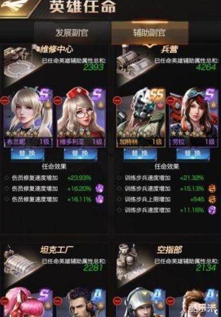 兵种建筑辅助副官推荐:SS级英雄加特林+S级英雄劳拉或S级英雄安琪拉