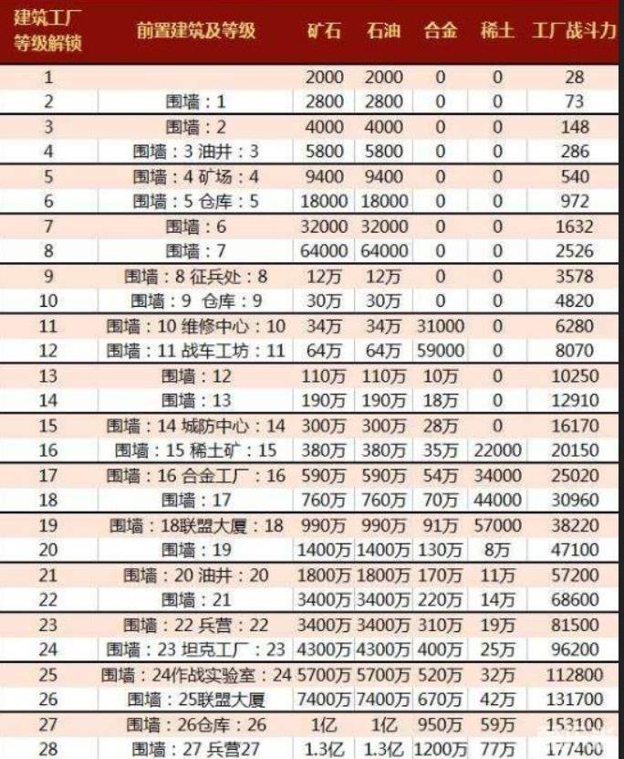 在建筑工厂的升级过程中,往往需要足够多的矿石和石油,以及围墙等级达到一定级别。当级数逐渐增长到一定阶段时,建筑工厂升级还需要其他高级资源:合金、稀土以及其他核心建筑物等级。建筑工厂升级的资源消耗,指挥官可以参考下表。