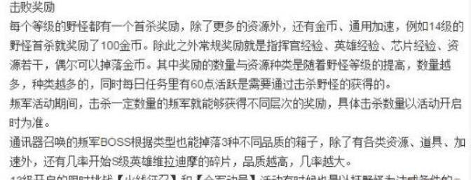 在特殊活动期间,会限时出现特殊野怪——叛军,与常规尤里野怪共享首杀奖励,也就是说你拿了14级的尤里野怪首杀奖励,再杀叛军野怪是不会获得首杀奖励的,击败他们的常规奖励与尤里野怪相似,但是还有几率掉落低中高3个等级的【叛军通讯器】来召唤对应等级的叛军boss。