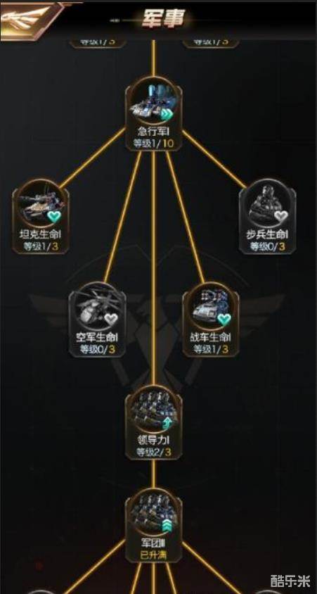 另外就是科技了,科技的加点,我是推荐从简单到难,先将耗时低的都点掉,而后再回到原点开始点,简单来说,先所有的都点掉一级来,然后再所有的点二级,依此类推。这里的话,我也给点具体的加点方式,首先是守城里面的两个全部队防御与攻击点满,然后在军事里优先点坦克防御与血,步兵攻击,战车攻击,这个顺序来点,可以最大程度利用好时间,并增加自身兵种的战斗力。另外,领导力技能的学习也是非常重要的,毕竟出征越多部队就约有保障。
