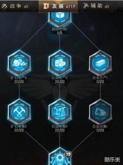 在战略点的页面一共有3个战略,分别是战争,发展和辅助。我们来看一下前面2个是建造加速和科研加速,10点投入进去就能得到2.5%的加成效果,别小看这点数据,当你发展到后期十几级的建造需要大量建造时间的时候,效果才能更加显著。发展页面有丰饶这个技能,能够让所有的资源点立刻获得5小时的产出,这个技能要配合后面的发展战略使用效果才能更加显著,我们要尽量让主基地等级和资源点等级同步发展,优先建造油井和矿厂,我发现到后面矿石是一直不够用的,反而合金和稀土是十分赋予的。高级油井矿厂,加上发展战略页面中的石油和矿石生产,最后使用丰饶技能,就能获得数量可观的资源供自己发展了。