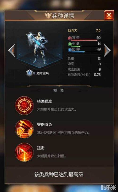 最终能够获得3个技能解锁取人性命于9格之外的超时空兵,其数据如下: