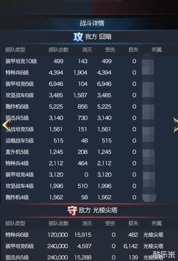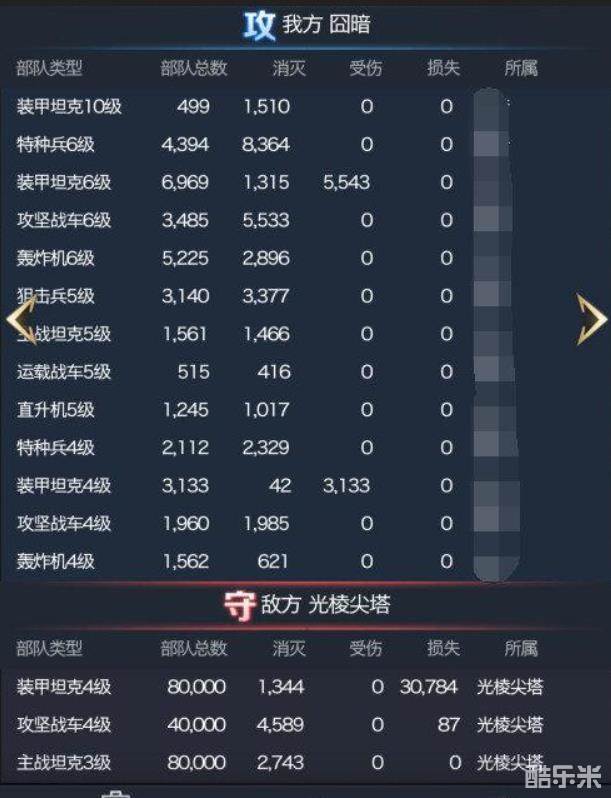 如下图战报所示,当前排没破的情况下,特种兵的杀敌数非常夸张的是狙击手的2倍以上,但是前排装甲坦克一旦被破,特种兵的攻击距离较短,伤亡是远大于狙击手的,其杀敌数也是明显的降低,这说明在势均力敌的情况下,或者敌方具有大量跨前排打击能力兵种的时候,特种兵的高效杀伤并无法保证。