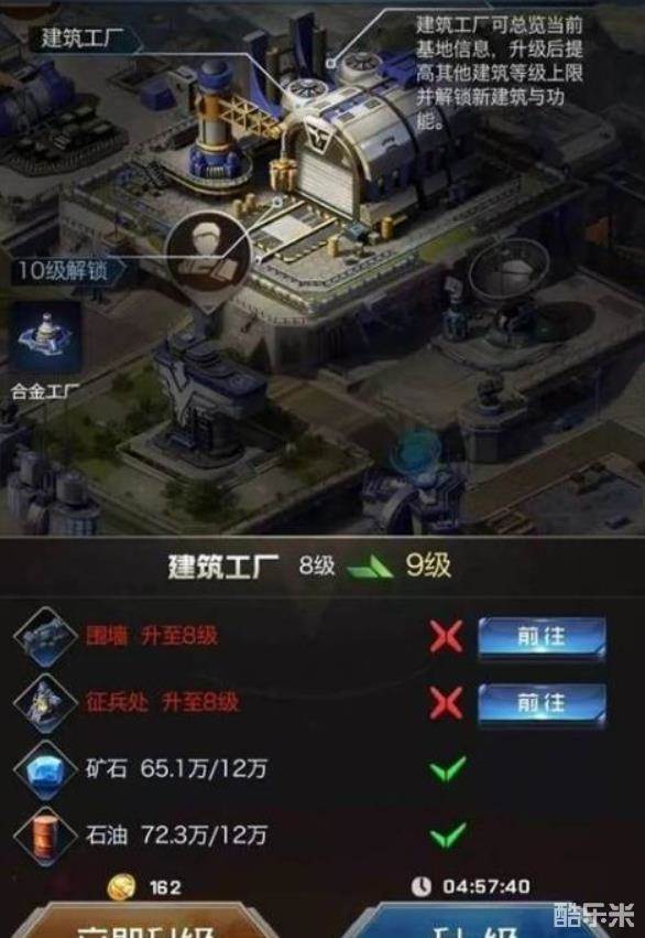 前期只升级建筑工厂及建筑工厂前置建筑,尽量不要浪费资源进行其他建筑的提升,否则资源将非常匮乏。原因是建筑工厂等级越高,兵种的等级也越高,则攻防血能力值越高,所以谁能更快的提高建筑工厂等级,谁就占有极大的优势。