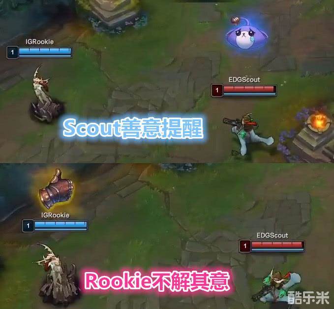 Rookie冰女没买装备确实特别伤,白白浪费了一个TP,压制不住EDG中单Scout飞机的发育。其实Scout本人并不希望自己白占便宜,他还是希望能与Rookie来一场公平的较量,不想趁人之危。在小兵出生之前,Scout飞机就已经发现Rookie冰女没买装备了。于是他向Rookie亮了表情,善意提醒Rookie买装备。不过Rookie不理解Scout的表情是啥意思,还以为Scout在向他打招呼,于是Rookie傻傻地回了个点赞。此时Scout非常无奈,估计他都想打字让Rookie回家了吧。