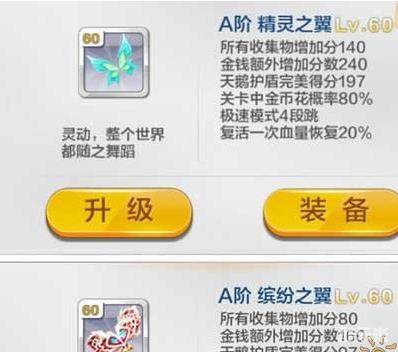 精灵之翼活脱脱就是我们想象中的精灵所拥有的翅膀,绿色而泛着微微光芒的造型,给人一种置身如梦境中翩翩起舞的感觉。属型方面也是非常梦幻的,除了满级那超长的磁铁效果,收集物加分和金钱额外加分也是不错的刷分属型,虽然比不上战斗之翼那种刷分大杀器,但是有着复活回复30%如同保险一般的保命技能,手残党也有福音了。