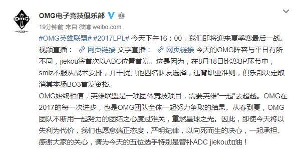 在今天下午的比赛中,OMG官方突发微博声明“SMLZ不服管理,禁赛本周LPL夏季赛常规赛BO3首发位置”,这种临阵换将的行为一时间让各位小伙伴大跌眼镜!