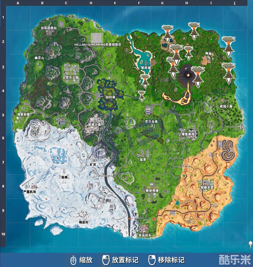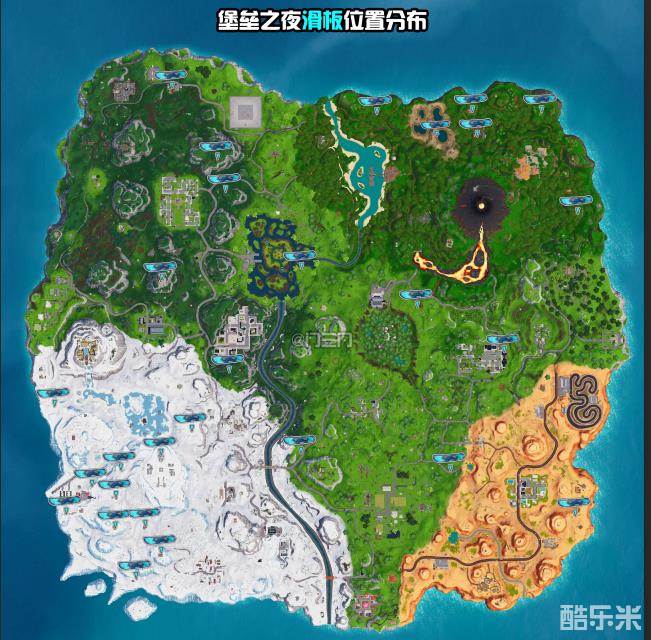 这里给大家放出肥宅球、滑板和火山喷泉的刷新位置,滑索的话在非常好找,在雪地和火山旁边随意溜达就能看见!
