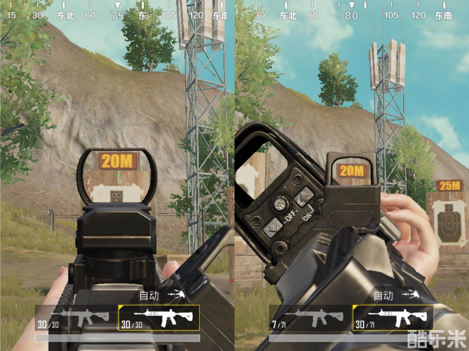 我们拿大家最熟悉不过的M416来举例,在同时配备上红点(全息)和侧瞄准镜后,开镜后的侧瞄准镜乍一看上去和红点全息长的非常像,更像是他们的缩小版本。从视野来看,侧瞄准镜和红点与全息能看到的可视距离也是一样的。再者,由于侧面瞄准镜是一个偏辅助类型的瞄准镜道具,本身体积也比较小,所以在开镜之后的镜头画面大小上,侧瞄准镜比红点全息能看到的区域更少。在训练营中我们拿20米距离的靶位来进行对比,在同样的位置下,侧面瞄镜开镜后看到的画面要比红点全息小一倍,并且还会因为同时使用两种倍镜的原因遮挡一定的的视野,所以测瞄准镜搭配红点或全息可以说是完全没有必要,得不偿失。