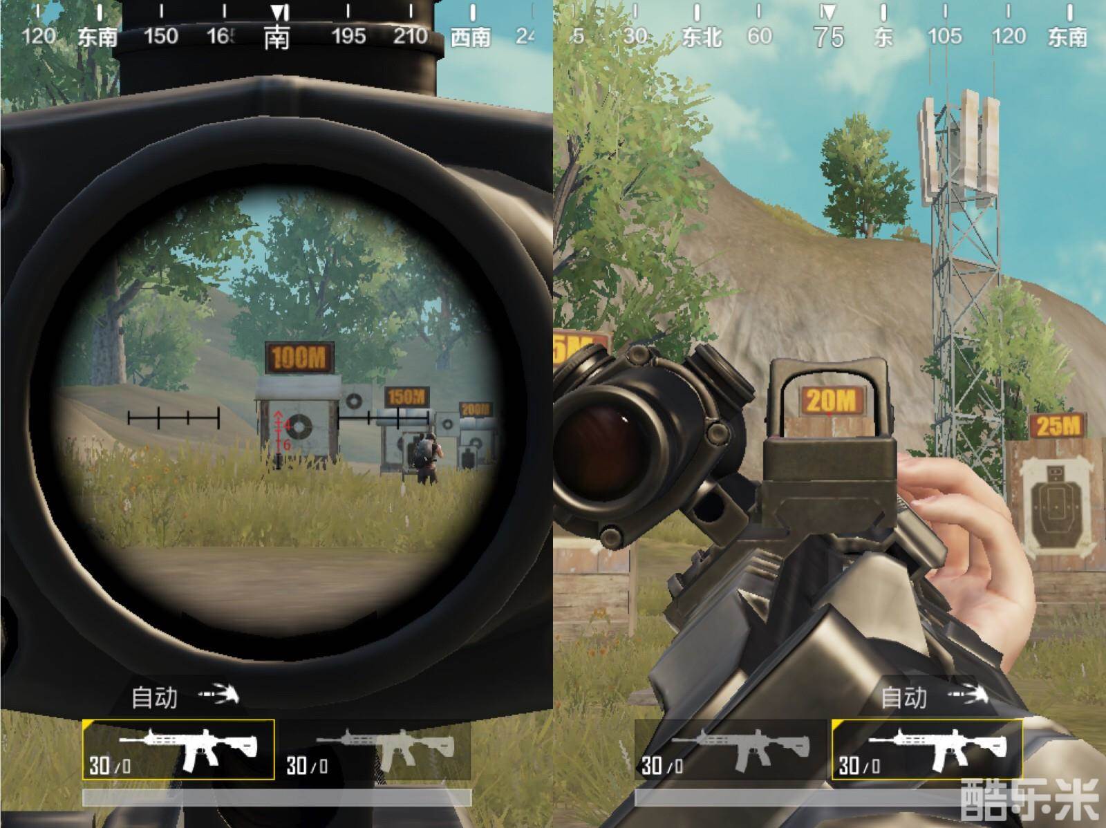 我们再看到中远距离的倍镜,在装备了3倍镜和4倍镜的M416后,同样的距离开镜效果差别不是特别大,所以我们把它们放在一起和侧瞄准镜做搭配对比。从对比图中可以发现,侧瞄准镜不管是在20米或是100米上,在视野上对这两种倍镜的帮助都不大,近的不如它们看的全,稍远点的又不如它们看的清。但是这种中远倍镜虽然视野方面的能力相对比较全面,在攻击移动敌人和移动车辆上面的能力却远远不如侧瞄准镜这种近距离倍镜来的顺畅,二者如果搭配起来可以算得上锦上添花了。