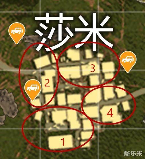 在莎米,不推荐跳中心区域,由于这里没有明显的制高点,跳中心区域只会被其他区域的敌人包夹,得不偿失。建议跳1号区域的仓库,理由就是这里的物资可以直接获得,能占据前期的优势。但如果跳伞过程中发现跳仓库的敌人多,可以转向跳到2号区域,那里的地形复杂,敌人即使先拿枪也很难可以将玩家击倒。