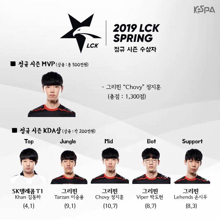 同时,LCK官方也为各位置KDA最高的选手每人颁发了“KDA”奖,奖金是一位选手200万韩元(折合人民币约11835元),除了SKT的Khan选手拿到了上单位置的这一奖金之外,这一奖项的其他四个位置全部被GRF战队所把持。