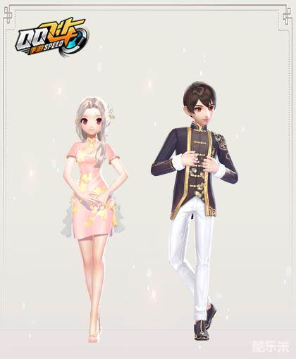 女生身着一套粉色短旗袍,尽显温柔气质,仪态万方。在阳光的照射下,金色的梅花纹样若隐若现,优雅妍丽。男生则是唐装式样,深色的上装用金色的盘扣与图案点亮,气宇轩昂,高洁淡雅。两人携手,将传统之美展现得淋漓尽致。
