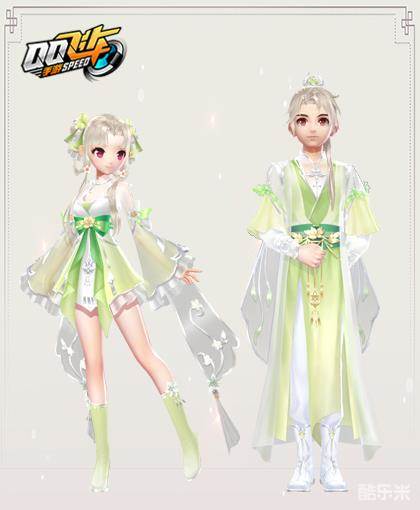 在漫天飞花与飘叶之间,有这样两个灵动的仙子。女生用绿色的丝带扎着俏皮的双马尾,一身翠绿的短裙,腰间系着的蝴蝶结可爱十足,随着手臂的舞动,长袖轻纱也飘扬起来。男生则是身着绿色长袍,用金制的叶片点缀在腰间,显得庄重华贵,衣袂随风飞舞,君子温润如玉。