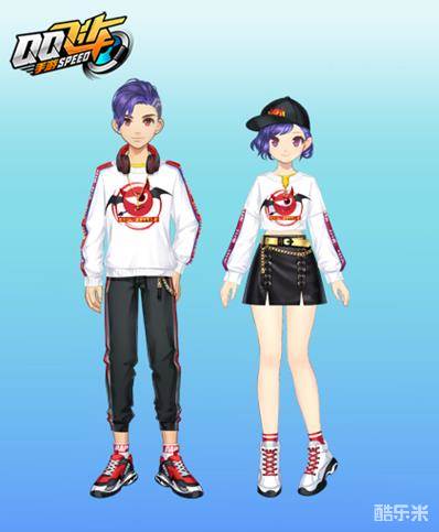 蓝紫色头发个性张扬,白色的圆领卫衣印制夸张小恶魔图案,搭配黑色的运动裤,完全是运动少年该有的样子呀。黑色的棒球帽为套装增添动感,短款卫衣凸显女生姣好的身材,黑色小皮裙妩媚动人,金色的腰带是小恶魔套装的点睛之笔。