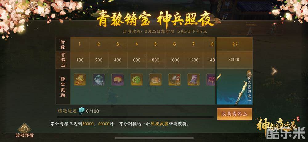 在半周年庆典活动期间,青黎铸宝活动也已开放!降妖师们通过完成每日铸宝任务收集青黎玉。当青黎玉的数量累计达到30000时,可挑选一把任意职业的“照夜”武器铸造获得。而当青黎玉的数量累计达到60000时,不仅可以再挑选一把未拥有的“照夜”武器铸造获得,同时还将为已拥有的照夜武器激活照夜·普攻光效。