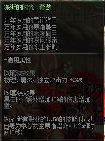 为了能快人一步,想必有不少小伙伴都选择了奶萝和剑鬼偷跑。而在没转职的情况下咱们该怎么深渊、搬砖呢?冻逝的时光套装就是在这种情况下被发掘出来的。这一套装备每个单件都有一种特效,五件一起上阵触发场面会变得极度混乱。毫不夸张的说,你甚至只需要平A就能做到白图的通关了!而且通关速度丝毫不比转之后的职业慢!
