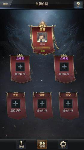 作为皇帝当然还有任职官员来辅佐自己的权力。皇朝设5个官职,除皇帝外所有的官职都只能由皇帝授予与废除,每个官职可设置1个玩家,皇朝官职拥有一定的属性加成和俸禄。如左丞相官职拥有全兵种攻击力加20%的加成,右丞相则可增加全兵种20%的防御力;其他三个官职也分别增加穿透、护盾、抵抗等新属性。官职加成可以说是非常强力,有实力的主公们都可前去谋求一官半职,从而进一步增强自己的实力。