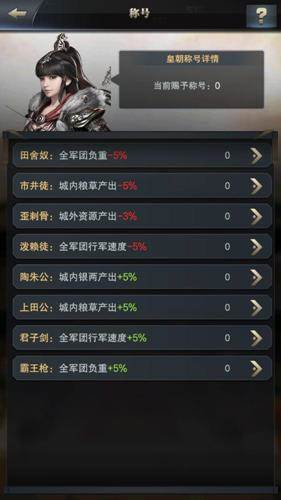 同时,皇帝可以给其他主公设置称号,被设置称号的主公会获得一个称谓,称号生效期间不能更换称谓。每一个称号都有对应的增益或减益,持续1天时间。增减的属性包括负重、资源产出、行军速度等加成。具体效果如何,还请各位主公在游戏内亲自去尝试吧。