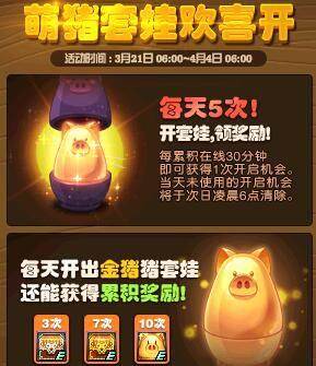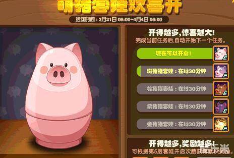 活动的名字叫作萌猪套娃欢喜开,听名字就能看出来,是一个开套娃的游戏,每天可以开启五次,每累计在线三十分钟就可以获得一次开启机会,每开启一次套娃就可以获得一次奖励,另外每天开启第五次套娃还可以累积次数,从而获得累积奖励,下面就来看看活动奖励吧。