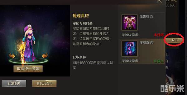 如果你为军团成员,当你的团长购买了军团外套后,你无需额外花费,只要在军团外套界面,点击“穿上”按钮,就可以穿上华丽丽的军团外套啦。当然,如果你想换上自己的着装,一样的,进入军团外套界面,点击“脱下”按钮,即可换下军团外套。