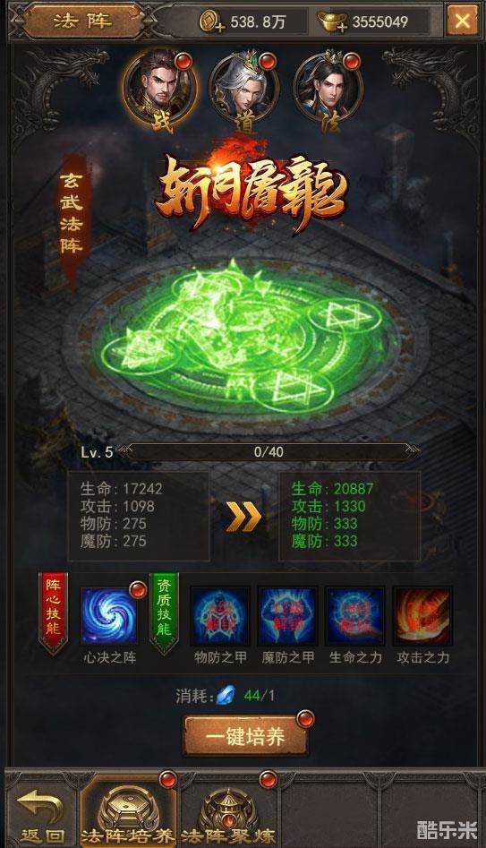每个角色拥有各自的法阵,法阵可以通过不同活动获取相应道具进行解锁。法阵解锁后可以进行养成,包括培养和聚炼,除了提供基础属性和战力值增加外,法阵的技能还可以对角色的其他系统属性进行百分比的提升。