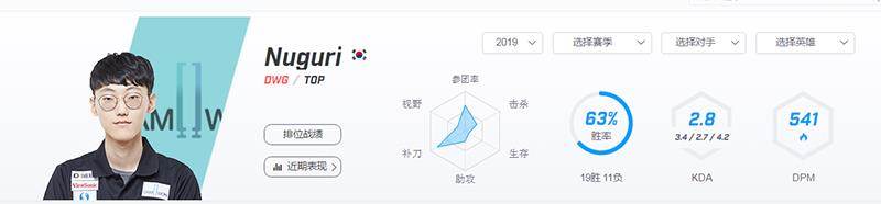 Flame和Nuguri的轮换机制目前看来效果还算不错,当然这更多的是因为Flame自己的状态问题,才回归的那几天发挥相当不错,可惜没高光多久就出现了巨幅下滑,尤其是打GRF的两把基本都没他什么存在感,不仅线上打不出优势,团战没找到开团和输出空间。Nuguri近几场比赛表现都还不错,特别是他的天使使用熟练度很高,前面打KT时一度在线上1V2单杀了Smeb,在团战中存在感也很高输出能力很强。另外,虽然前面他的杰斯在前期一度被对手针对得生活不能自理,但通过他个人的团战理解在后面的小规模团战中拿到人头不断补齐了自己的发育,前期1-3打成了7-4。从数据上看,他个人比较热衷于选择法师英雄或者单带英雄,因此有着541的DPM和123%,参团率也有65%,说明他的团战输出能力和支援效率相当可观。不过KDA仅有2.8,选手数据六芒星上他在生存这一板块的得分也是最低的,说明他的失误偏多,这方面需要注意